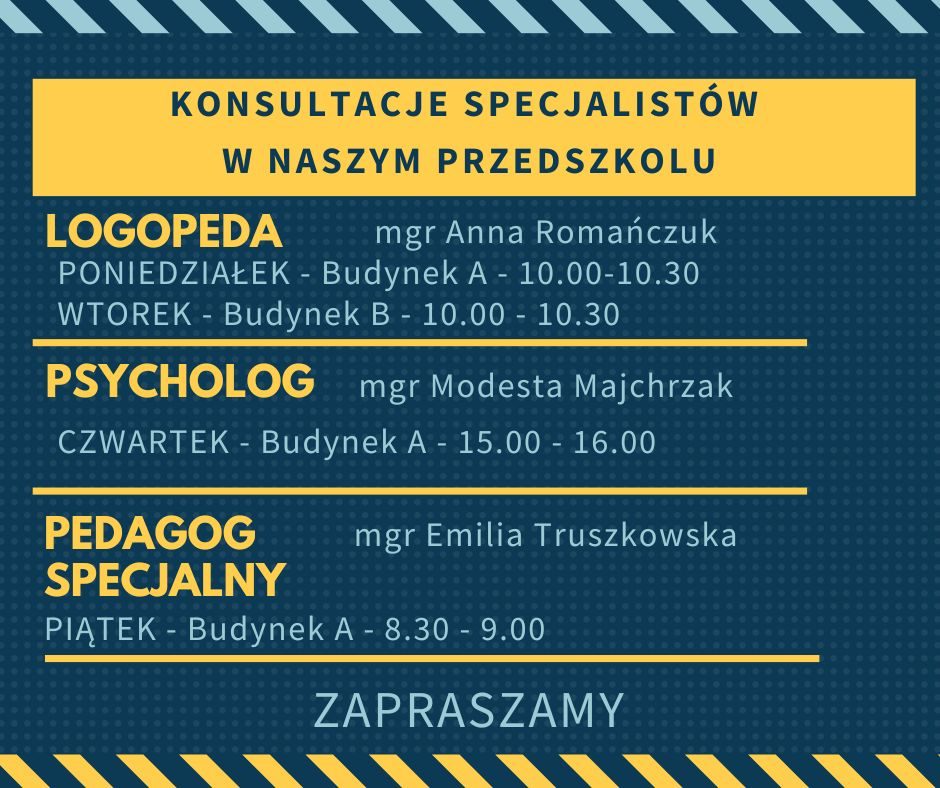 Miło nam poinformować, iż specjaliści w naszym przedszkolu prowadzą z Państwem konsultacje w poniższych terminach: