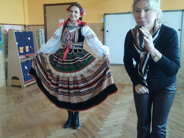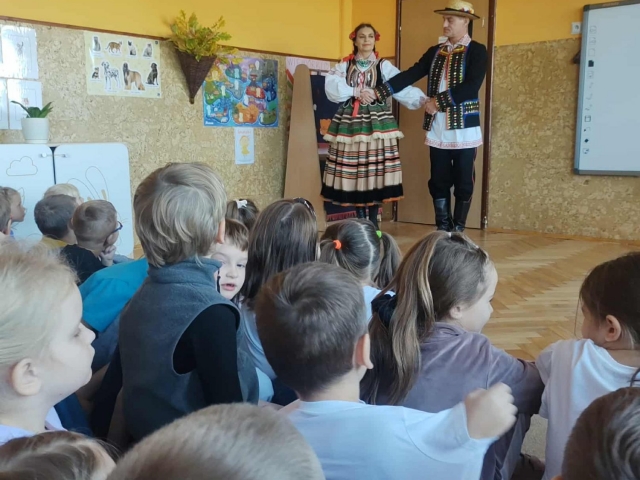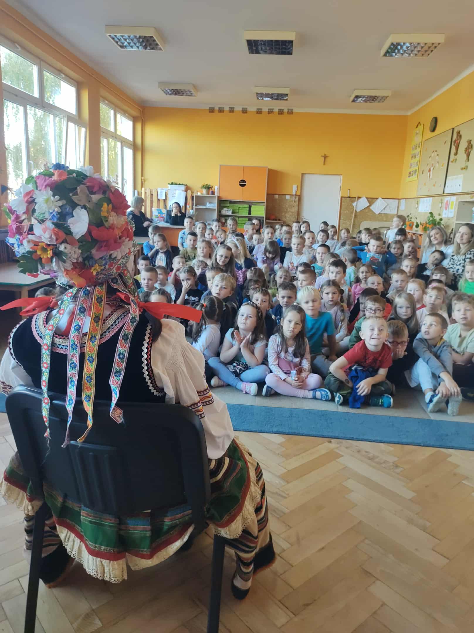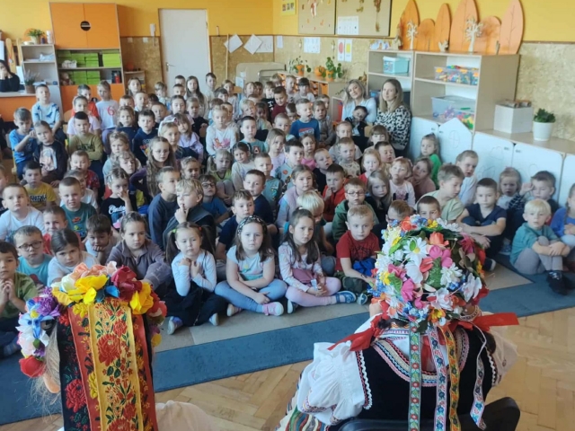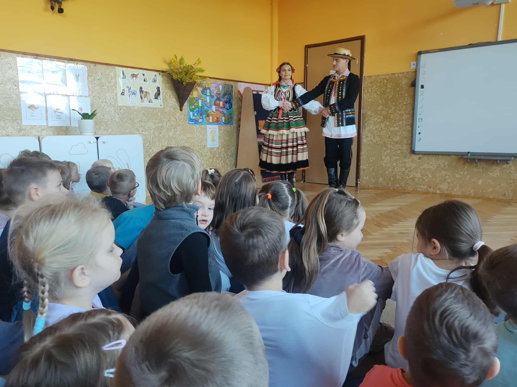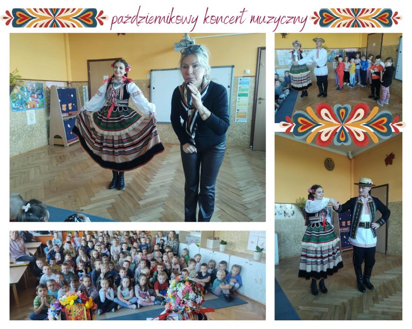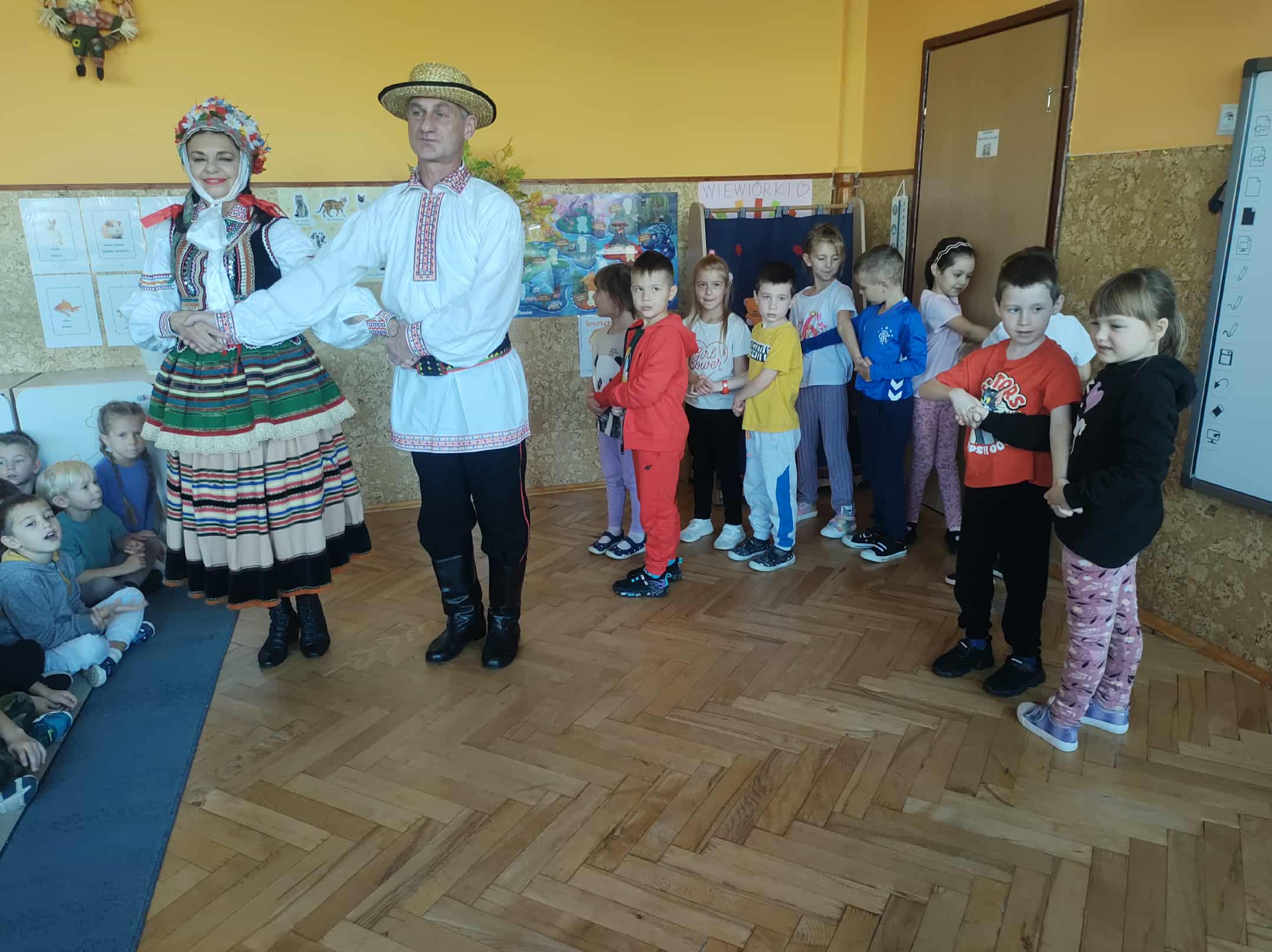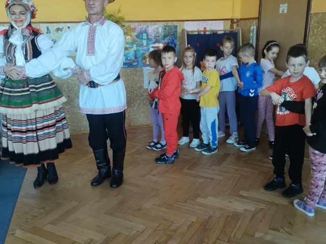 Całe widowisko uświetniła przedszkolakom para tancerzy w lubelskich strojach ludowych tzw. krzczonowskich , na których pięknie reprezentowały się charakterystyczne motywy zdobnicze. Przedszkolakom został zatańczony walczyk lubelski, cygan, mach oraz obereczek po lubelsku. Na koniec dzieci poznały jeden z lubelskich obrzędów weselnych– czyli oczepiny młodej pary. Przed nami listopad… Gdzie tym razem zabierze nas Pani Muzyka???