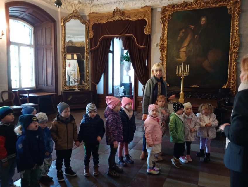 W dniu 23.10.2025r. dzieci z grupy Misie i Elfy były na wycieczce w Kozłówce. Po wnętrzach pałacowych Muzeum oprowadziła nas pani przewodnik, opowiadając w przystępny dla dzieci sposób o magnackich pokojach i ich właścicielach. Podziwialiśmy przepiękne piece kaflowe, marmurowe kominki, starodawne meble, pięknie zdobione lustra, lampy oraz kolekcję malarstwa. Zwiedzaliśmy kaplicę słuchając cichej muzyki organowej. W powozowni przedszkolaki zobaczyły końskie uprzęże, siodła, podróżne torby i akcesoria jeździeckie z XIX i XX wieku oraz dawne powozy, rowery, sanie. Spacerując parkowymi alejkami – słuchaliśmy śpiewu ptaków i zachwycaliśmy się bogactwem kolorów mijanej roślinności. Przepiękna jesienna aura, zaciekawienie i uśmiechy na twarzach były wyrazem zadowolenia dzieci z wycieczki.