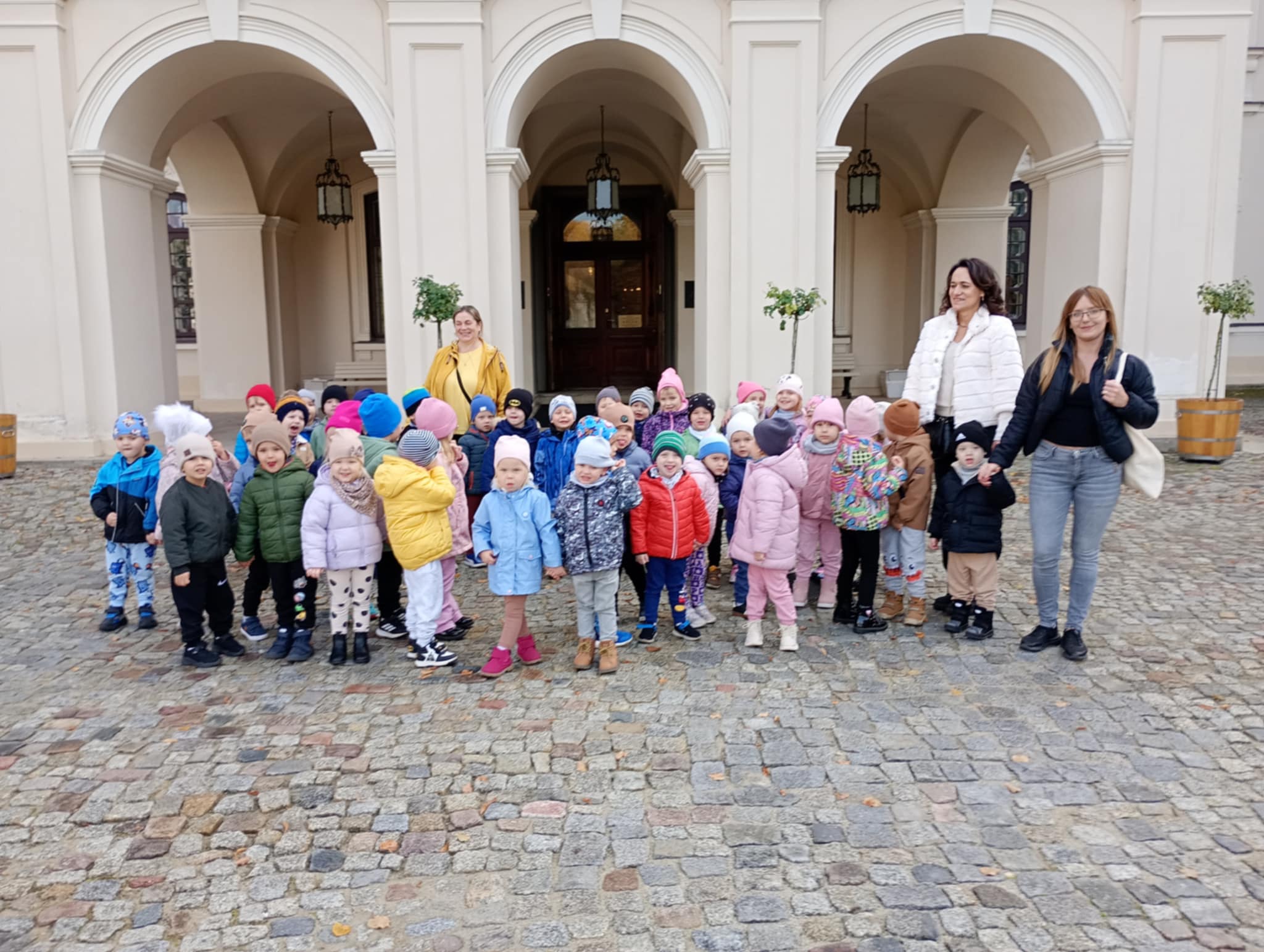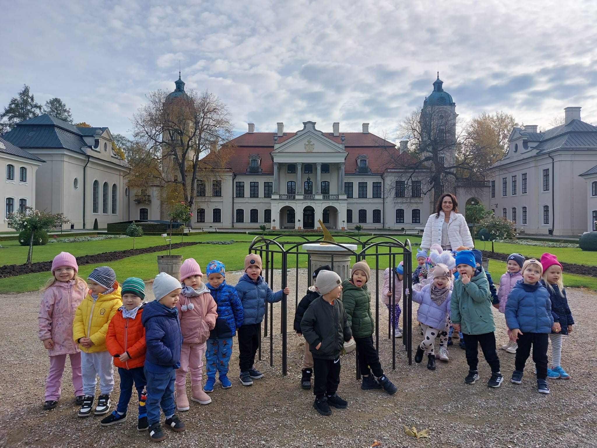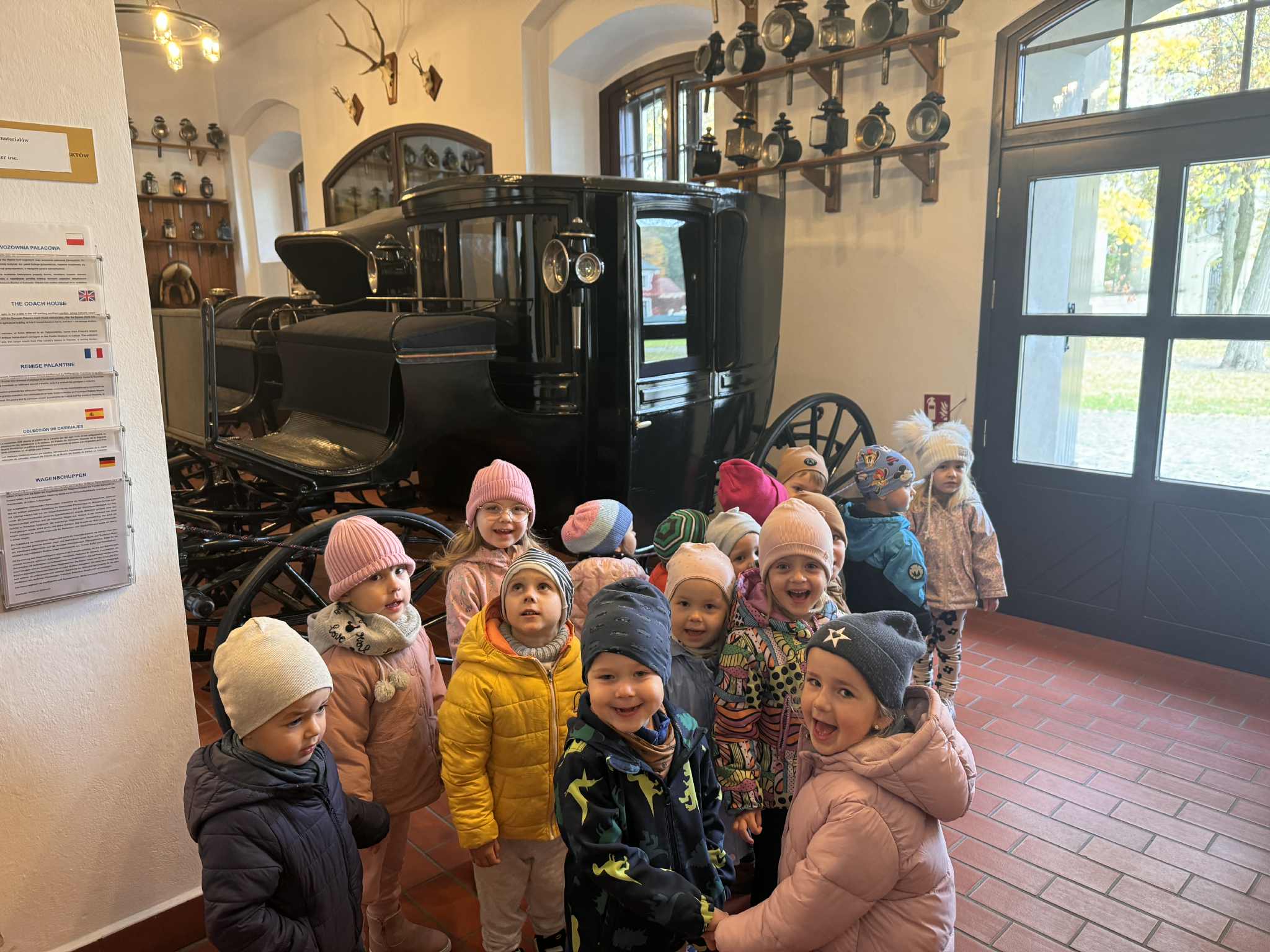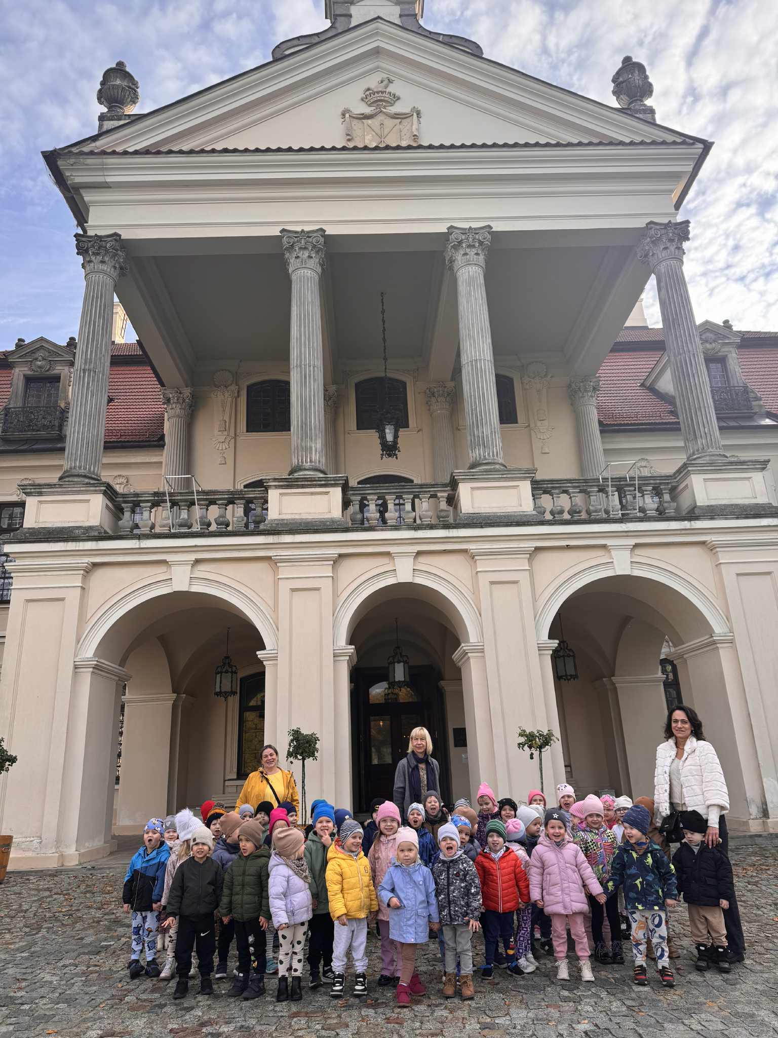 W dniu 23.10.2025r. dzieci z grupy Misie i Elfy były na wycieczce w Kozłówce. Po wnętrzach pałacowych Muzeum oprowadziła nas pani przewodnik, opowiadając w przystępny dla dzieci sposób o magnackich pokojach i ich właścicielach. Podziwialiśmy przepiękne piece kaflowe, marmurowe kominki, starodawne meble, pięknie zdobione lustra, lampy oraz kolekcję malarstwa. Zwiedzaliśmy kaplicę słuchając cichej muzyki organowej. W powozowni przedszkolaki zobaczyły końskie uprzęże, siodła, podróżne torby i akcesoria jeździeckie z XIX i XX wieku oraz dawne powozy, rowery, sanie. Spacerując parkowymi alejkami – słuchaliśmy śpiewu ptaków i zachwycaliśmy się bogactwem kolorów mijanej roślinności. Przepiękna jesienna aura, zaciekawienie i uśmiechy na twarzach były wyrazem zadowolenia dzieci z wycieczki.
