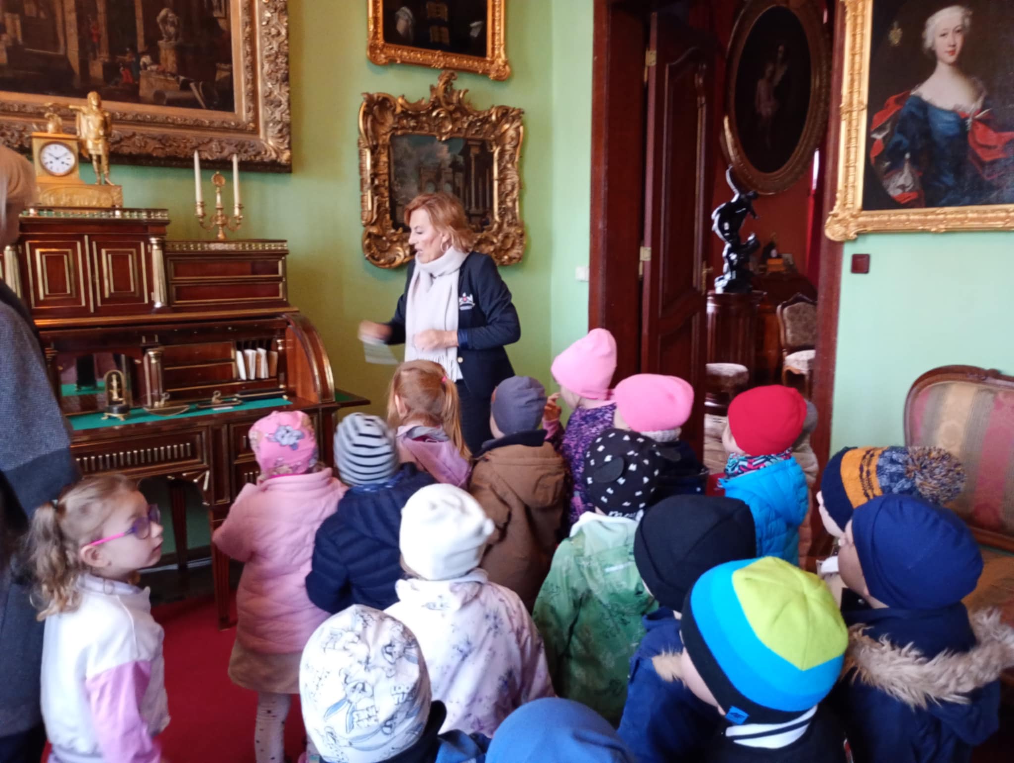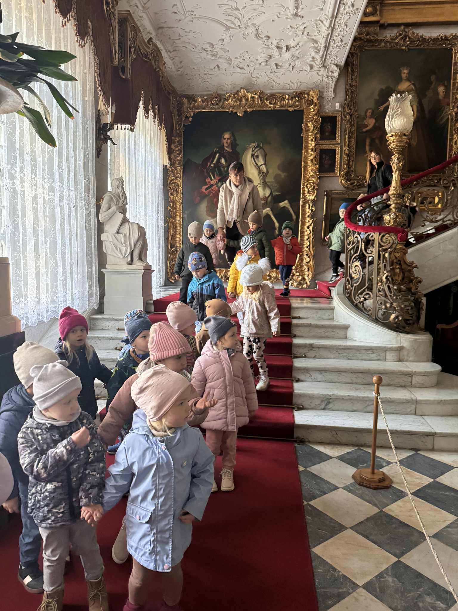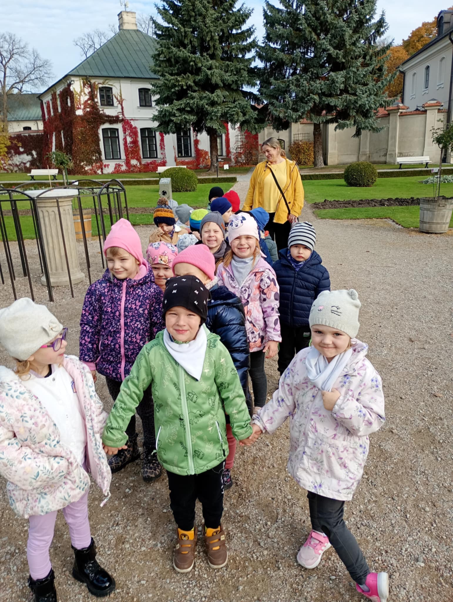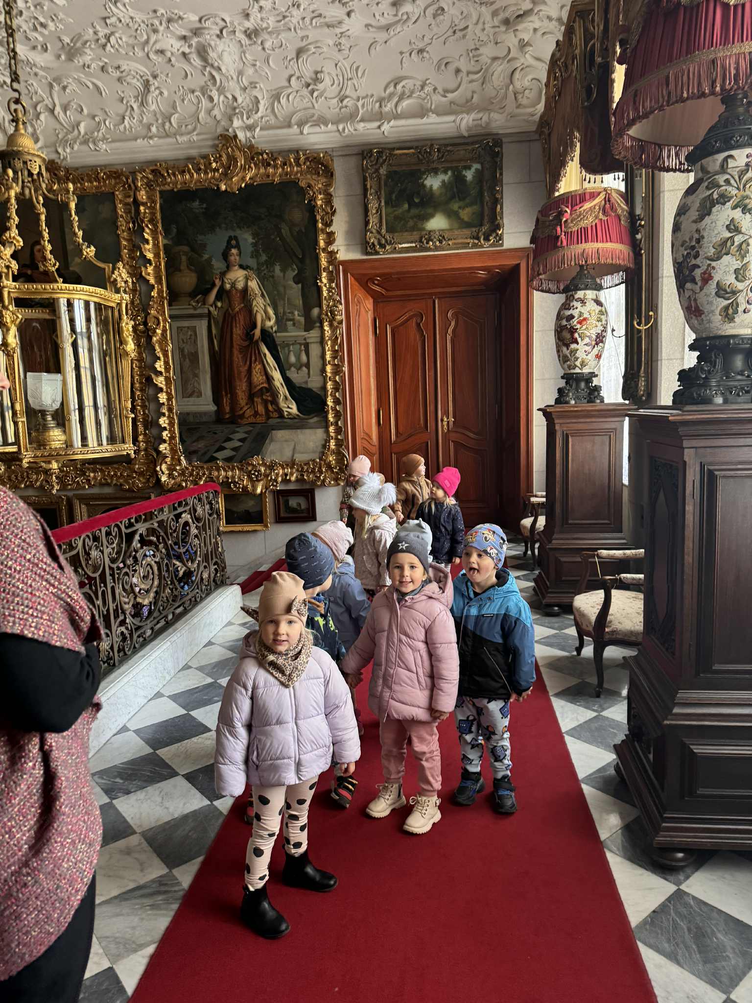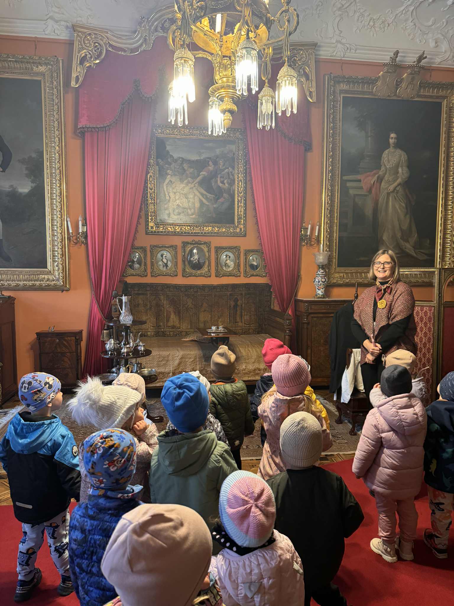W dniu 23.10.2025r. dzieci z grupy Misie i Elfy były na wycieczce w Kozłówce. Po wnętrzach pałacowych Muzeum oprowadziła nas pani przewodnik, opowiadając w przystępny dla dzieci sposób o magnackich pokojach i ich właścicielach. Podziwialiśmy przepiękne piece kaflowe, marmurowe kominki, starodawne meble, pięknie zdobione lustra, lampy oraz kolekcję malarstwa. Zwiedzaliśmy kaplicę słuchając cichej muzyki organowej. W powozowni przedszkolaki zobaczyły końskie uprzęże, siodła, podróżne torby i akcesoria jeździeckie z XIX i XX wieku oraz dawne powozy, rowery, sanie. Spacerując parkowymi alejkami – słuchaliśmy śpiewu ptaków i zachwycaliśmy się bogactwem kolorów mijanej roślinności. Przepiękna jesienna aura, zaciekawienie i uśmiechy na twarzach były wyrazem zadowolenia dzieci z wycieczki.