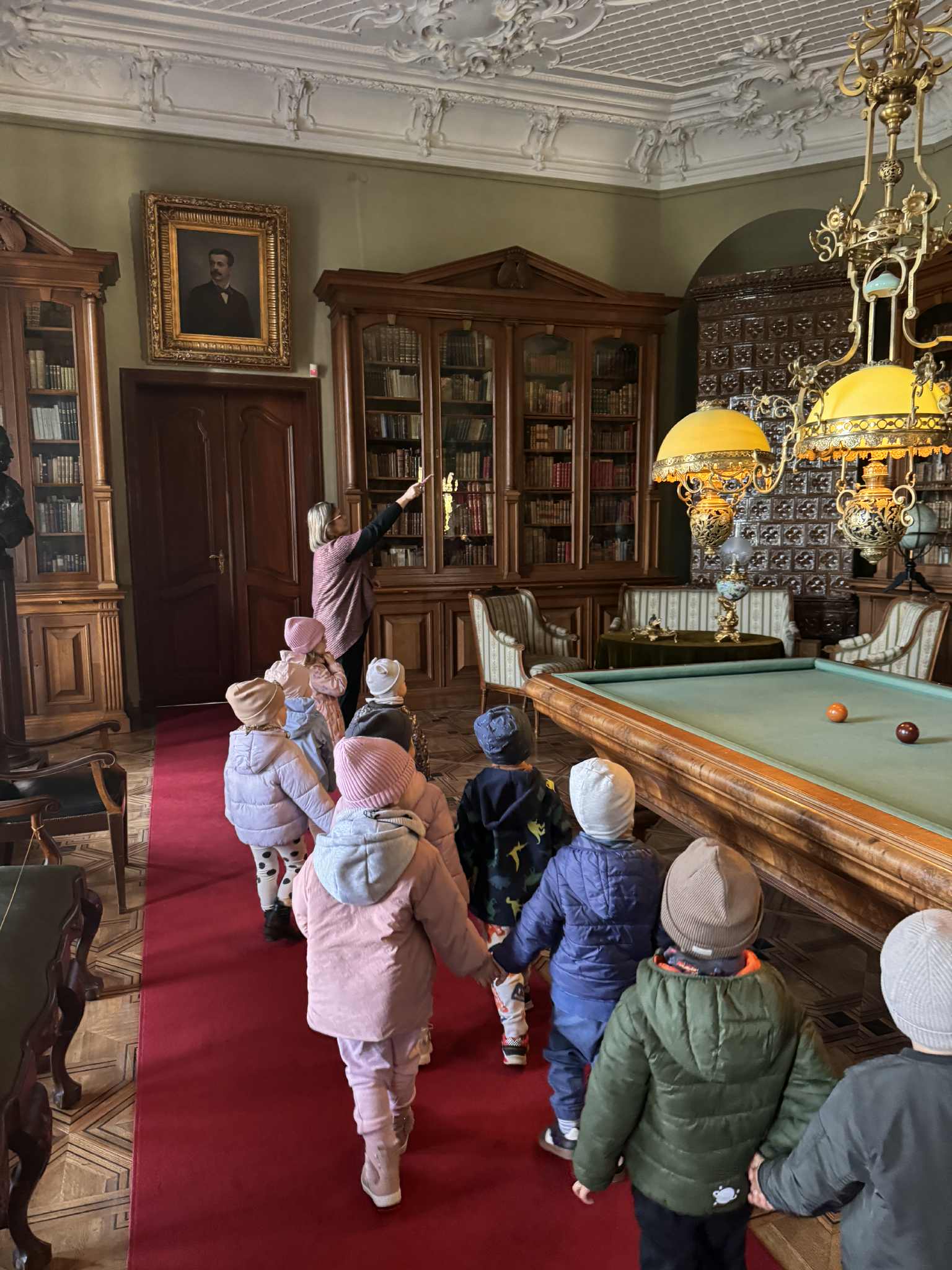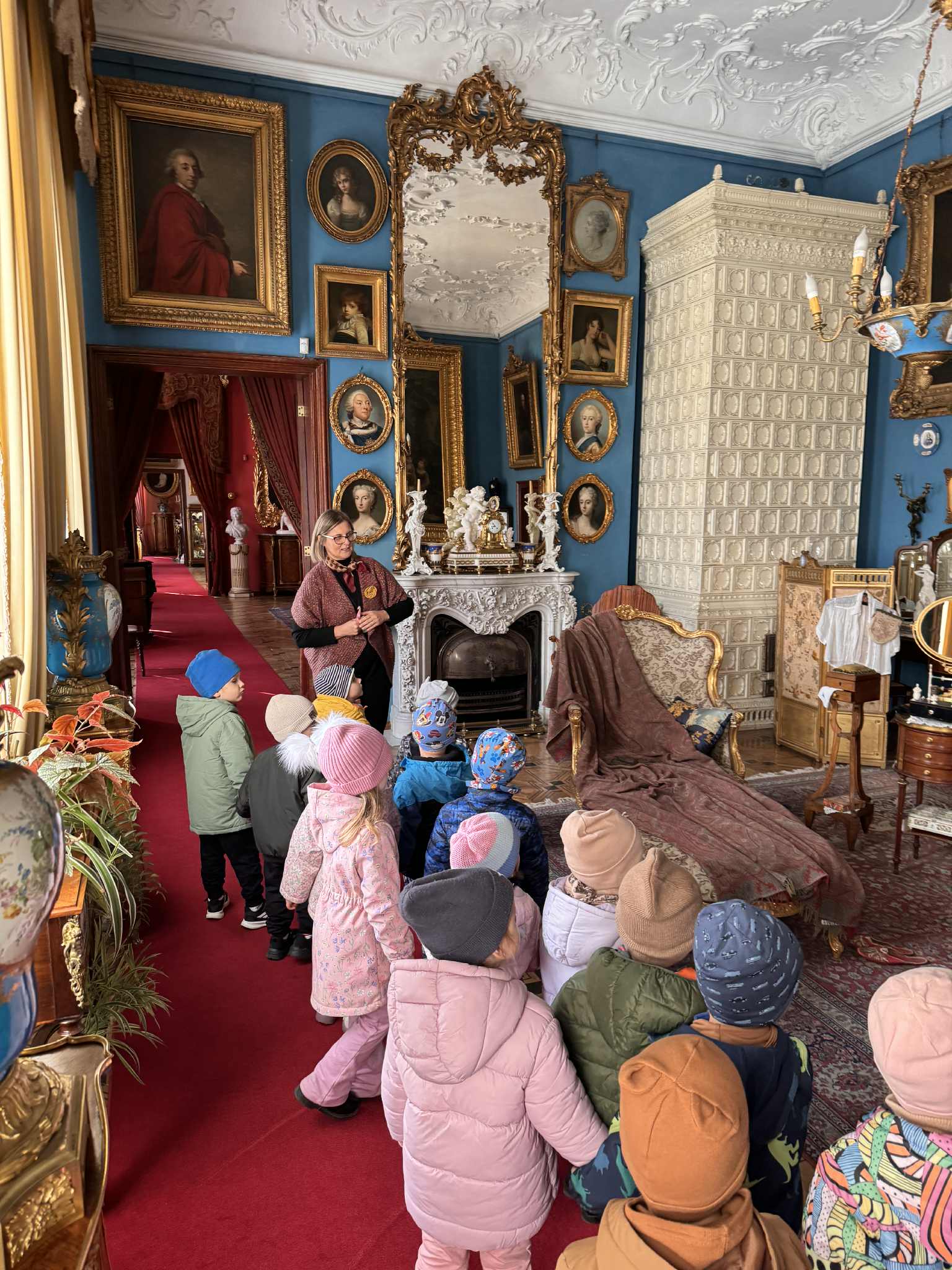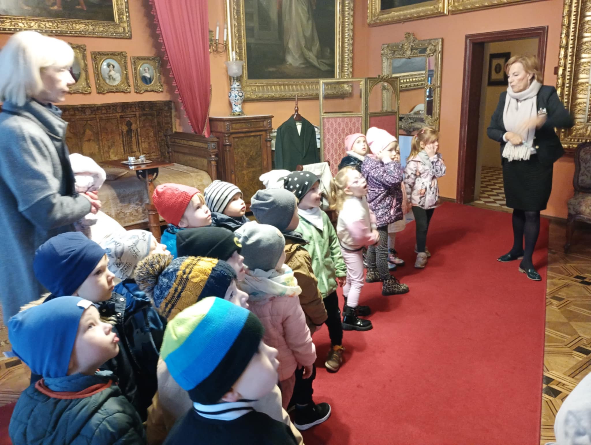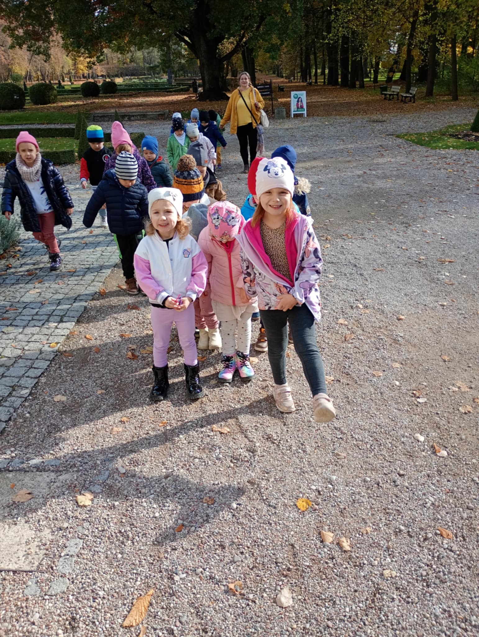 W dniu 23.10.2025r. dzieci z grupy Misie i Elfy były na wycieczce w Kozłówce. Po wnętrzach pałacowych Muzeum oprowadziła nas pani przewodnik, opowiadając w przystępny dla dzieci sposób o magnackich pokojach i ich właścicielach. Podziwialiśmy przepiękne piece kaflowe, marmurowe kominki, starodawne meble, pięknie zdobione lustra, lampy oraz kolekcję malarstwa. Zwiedzaliśmy kaplicę słuchając cichej muzyki organowej. W powozowni przedszkolaki zobaczyły końskie uprzęże, siodła, podróżne torby i akcesoria jeździeckie z XIX i XX wieku oraz dawne powozy, rowery, sanie. Spacerując parkowymi alejkami – słuchaliśmy śpiewu ptaków i zachwycaliśmy się bogactwem kolorów mijanej roślinności. Przepiękna jesienna aura, zaciekawienie i uśmiechy na twarzach były wyrazem zadowolenia dzieci z wycieczki.