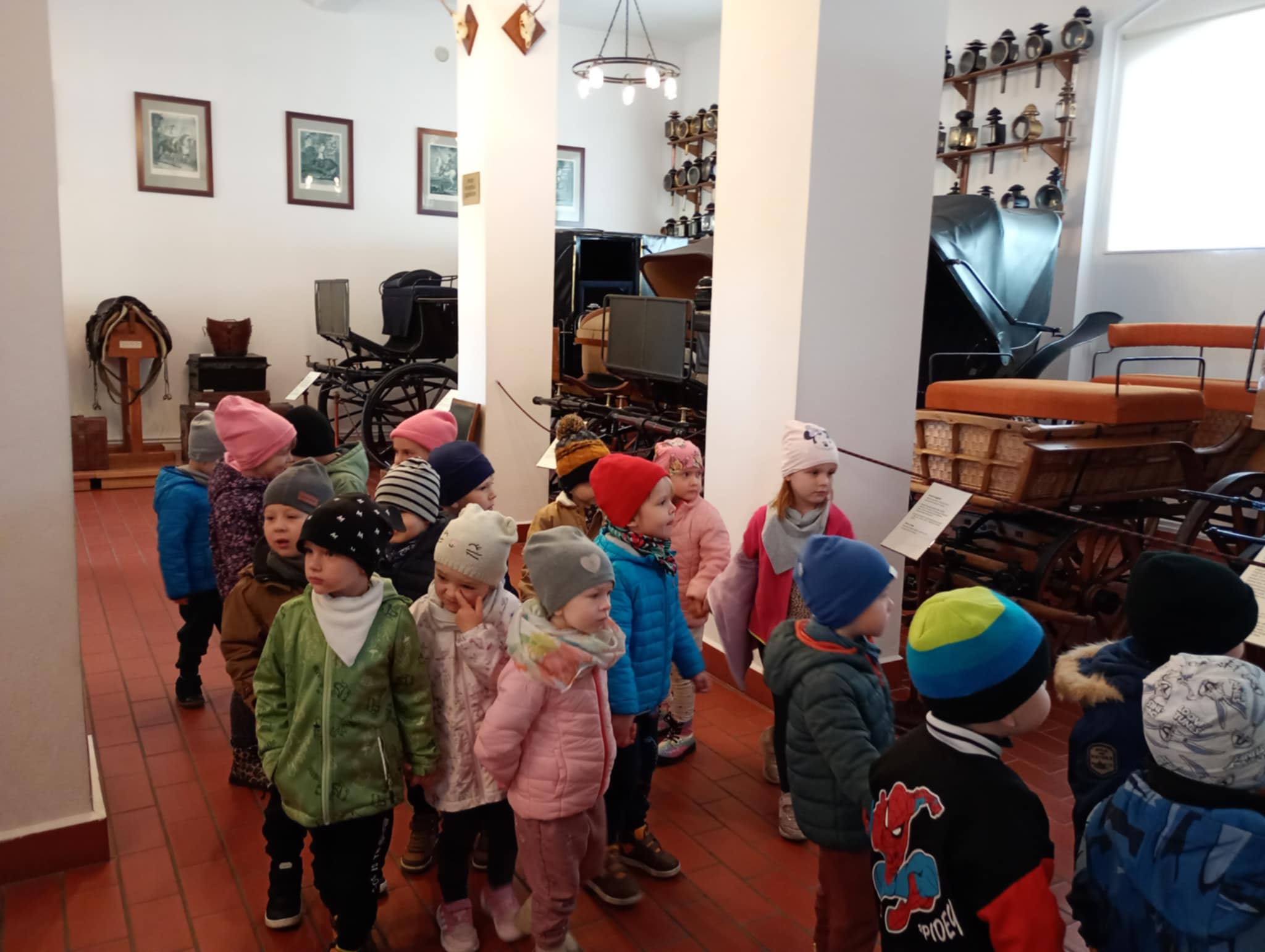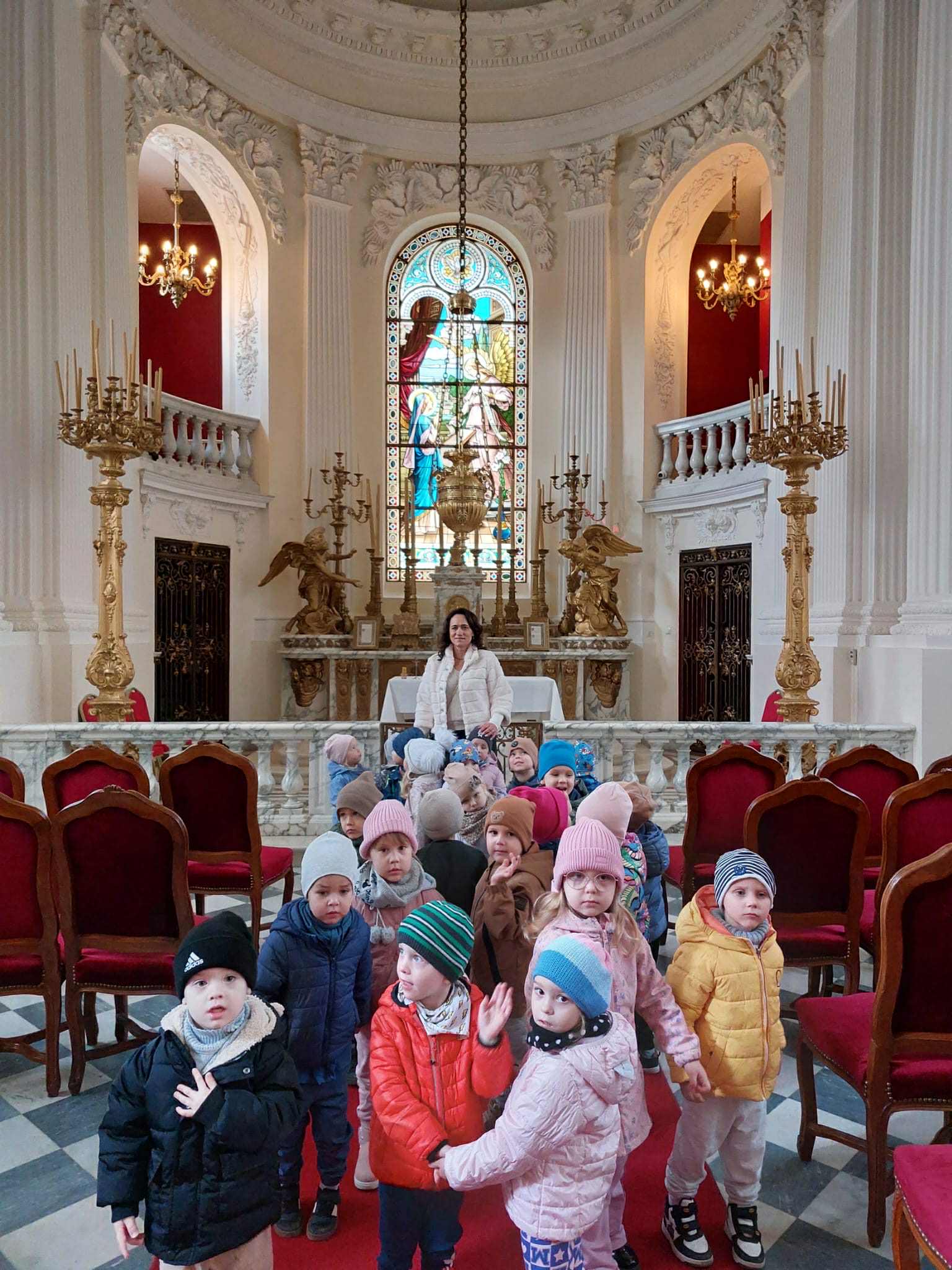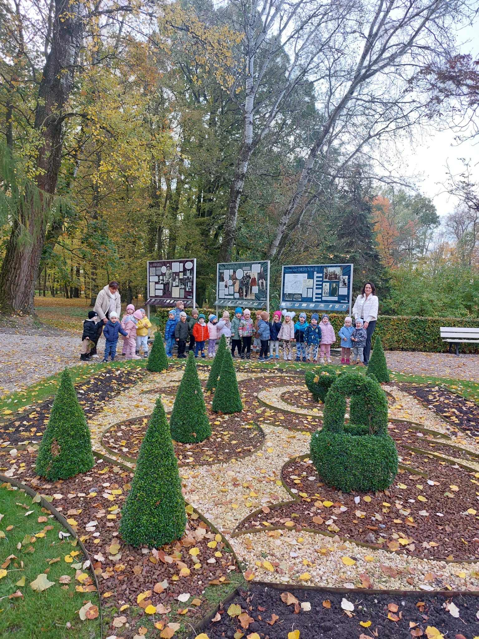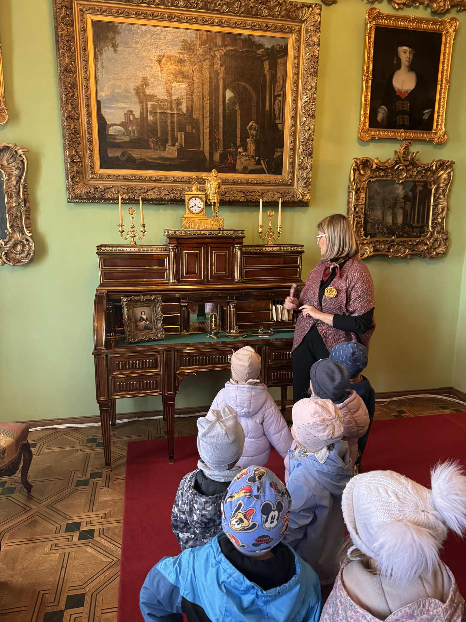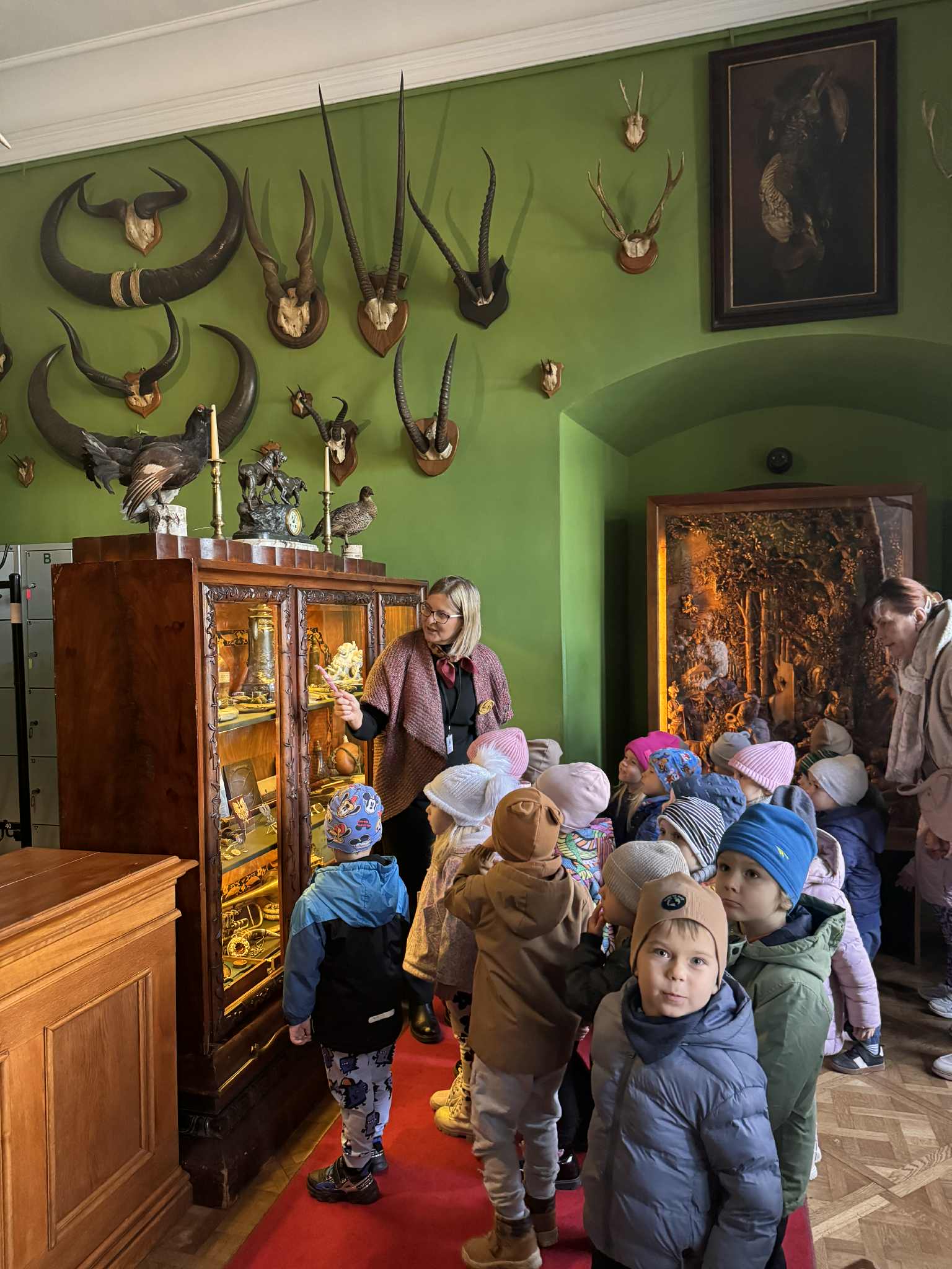 W dniu 23.10.2025r. dzieci z grupy Misie i Elfy były na wycieczce w Kozłówce. Po wnętrzach pałacowych Muzeum oprowadziła nas pani przewodnik, opowiadając w przystępny dla dzieci sposób o magnackich pokojach i ich właścicielach. Podziwialiśmy przepiękne piece kaflowe, marmurowe kominki, starodawne meble, pięknie zdobione lustra, lampy oraz kolekcję malarstwa. Zwiedzaliśmy kaplicę słuchając cichej muzyki organowej. W powozowni przedszkolaki zobaczyły końskie uprzęże, siodła, podróżne torby i akcesoria jeździeckie z XIX i XX wieku oraz dawne powozy, rowery, sanie. Spacerując parkowymi alejkami – słuchaliśmy śpiewu ptaków i zachwycaliśmy się bogactwem kolorów mijanej roślinności. Przepiękna jesienna aura, zaciekawienie i uśmiechy na twarzach były wyrazem zadowolenia dzieci z wycieczki.