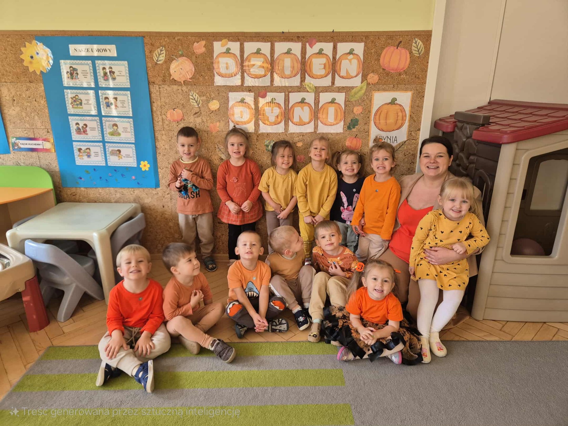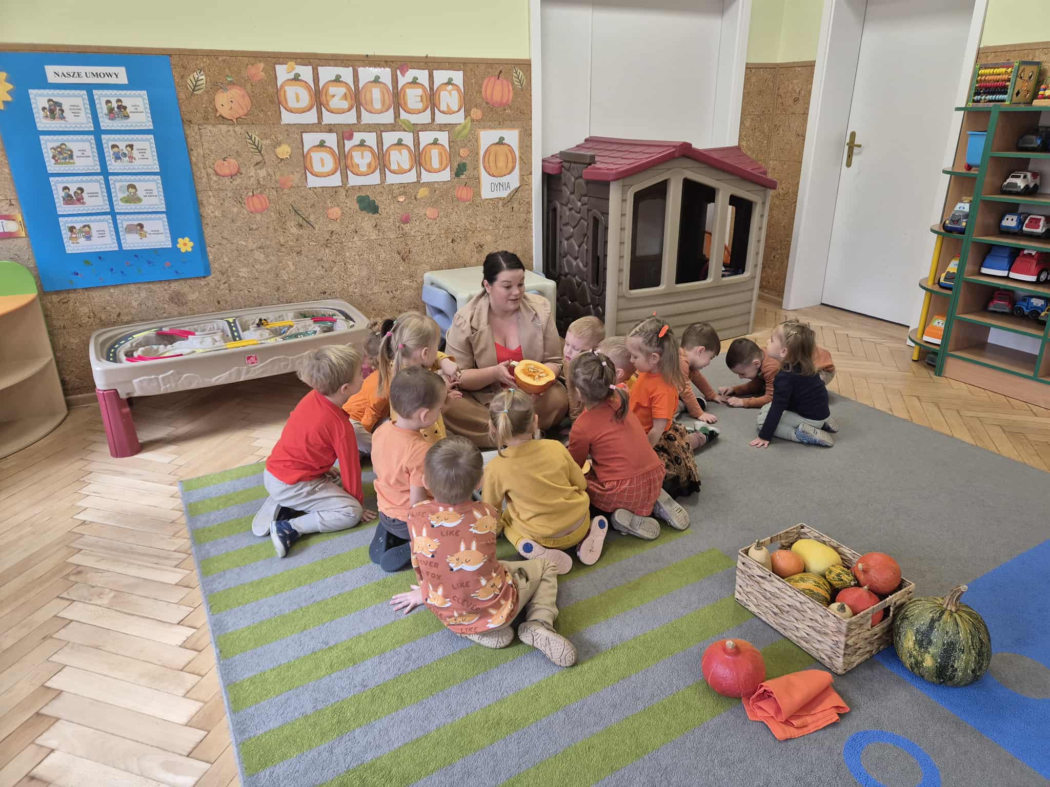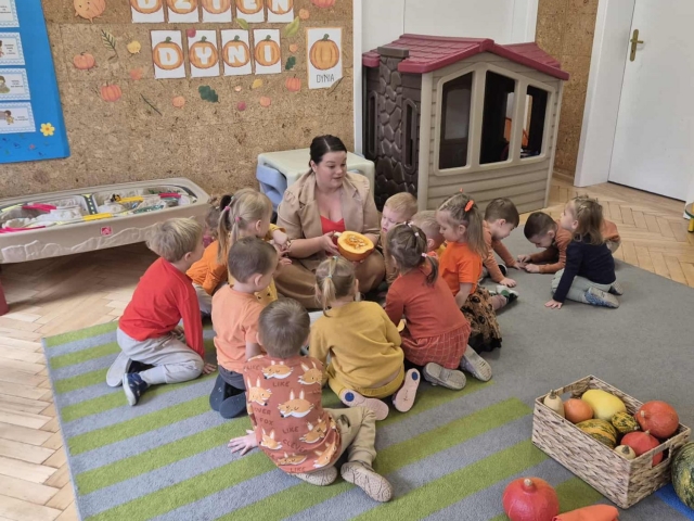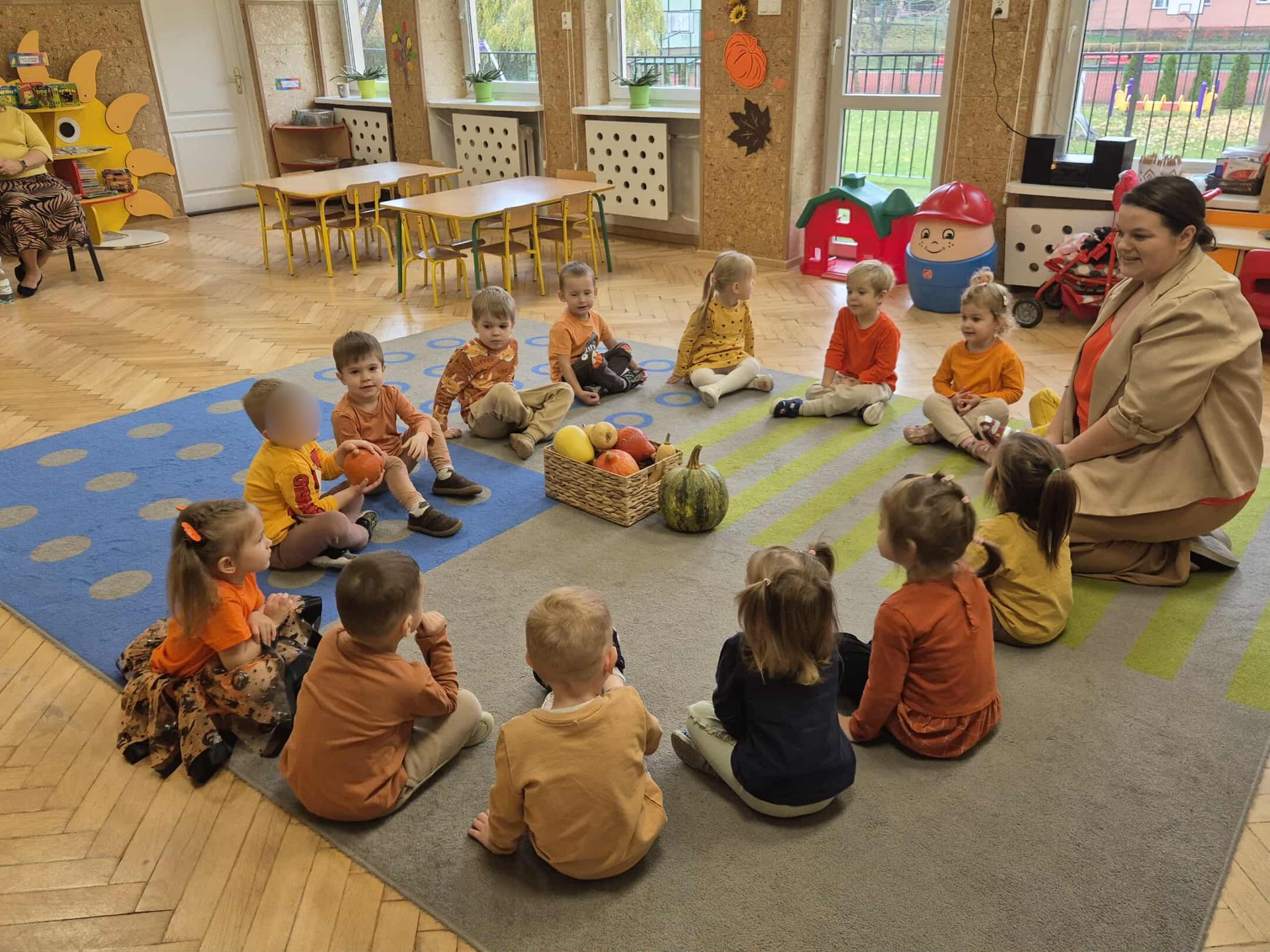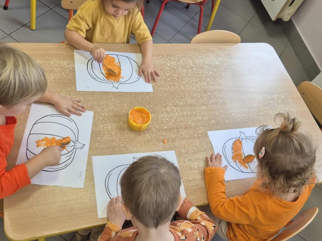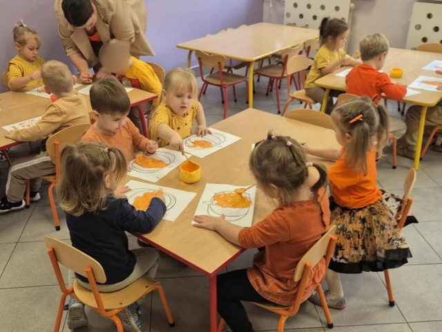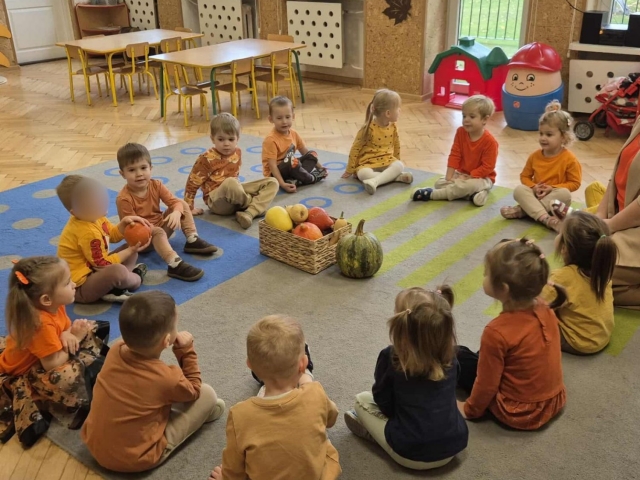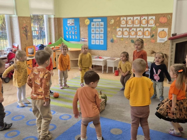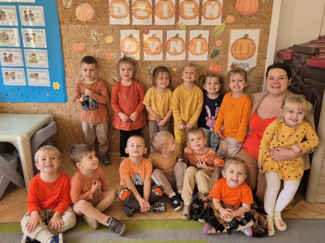 W naszym przedszkolu obchodziliśmy wyjątkowe święto – Dzień Dyni. Tego dnia dzieci z grupy „Słoneczka” przyszły ubrane w różne odcienie pomarańczu, tworząc niezwykle radosną, jesienną atmosferę. Wyruszyliśmy w niezwykłą podróż do „Krainy Dyni”, gdzie czekały na nas różne zabawy, zagadki i zadania z tym wyjątkowym warzywem w roli głównej. Podczas zajęć wspólnie poznawaliśmy dynię – dowiedzieliśmy się, jak wygląda w środku, jaki ma kolor i zapach. Dzieci dowiedziały się, że z dyni można przygotować wiele pysznych potraw, a nawet zdrowe przekąski z jej pestek, które mieliśmy okazję spróbować. Na zakończenie dnia wykonaliśmy pracę plastyczną – dzieci malowały swoje dynie przy pomocy magicznych farbek, które puchły po podgrzaniu. Efekty były niesamowite, a radość z tworzenia ogromna! To był dzień pełen zabaw, radości i pomarańczowego koloru – prawdziwe święto jesieni w grupie „Słoneczka”!