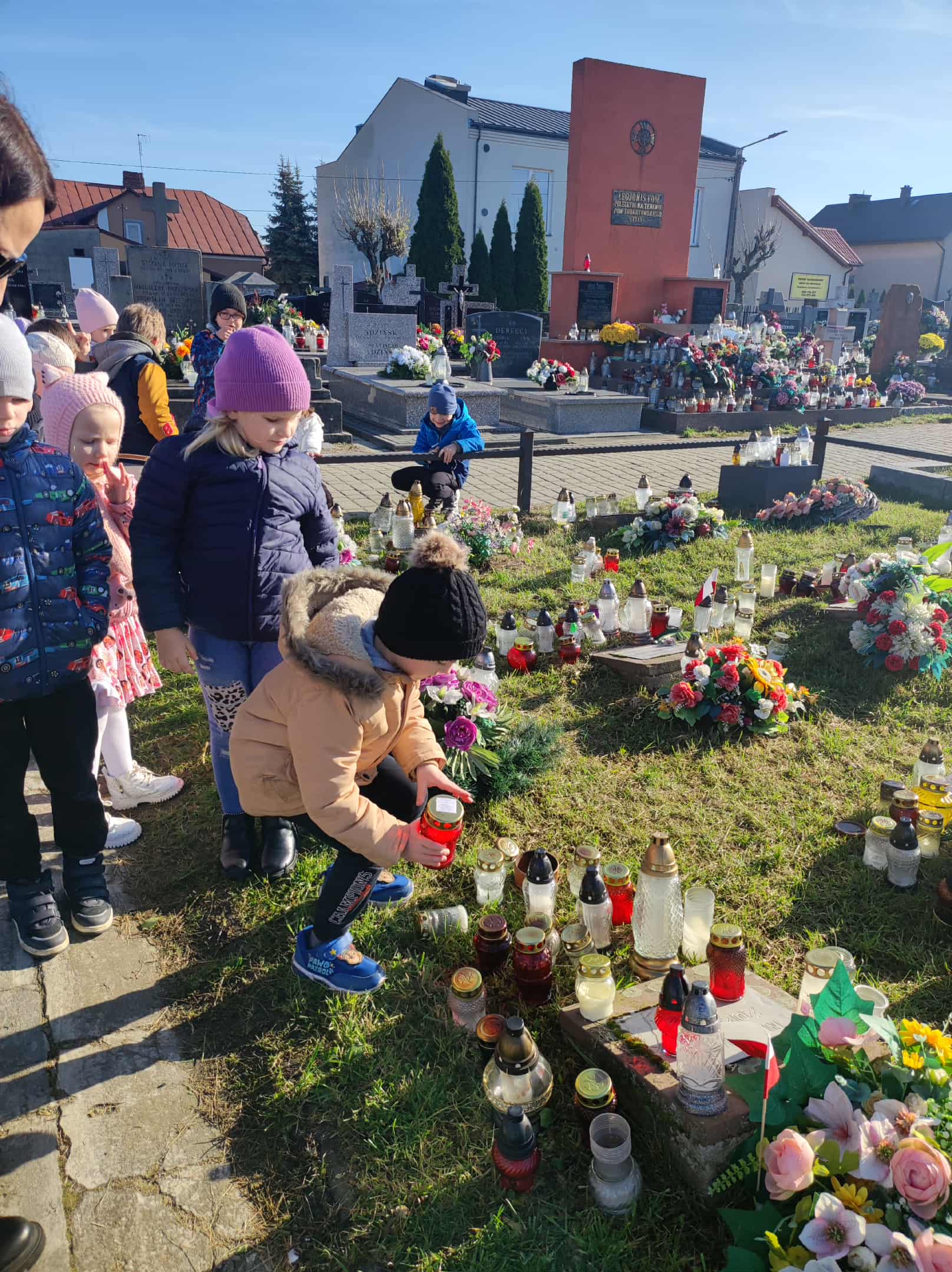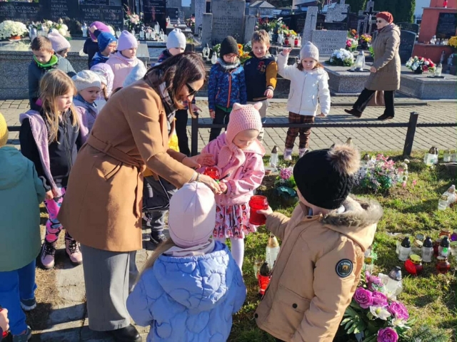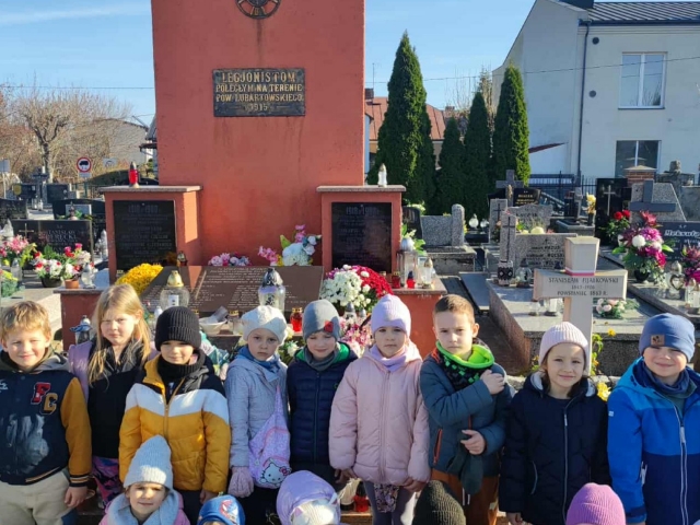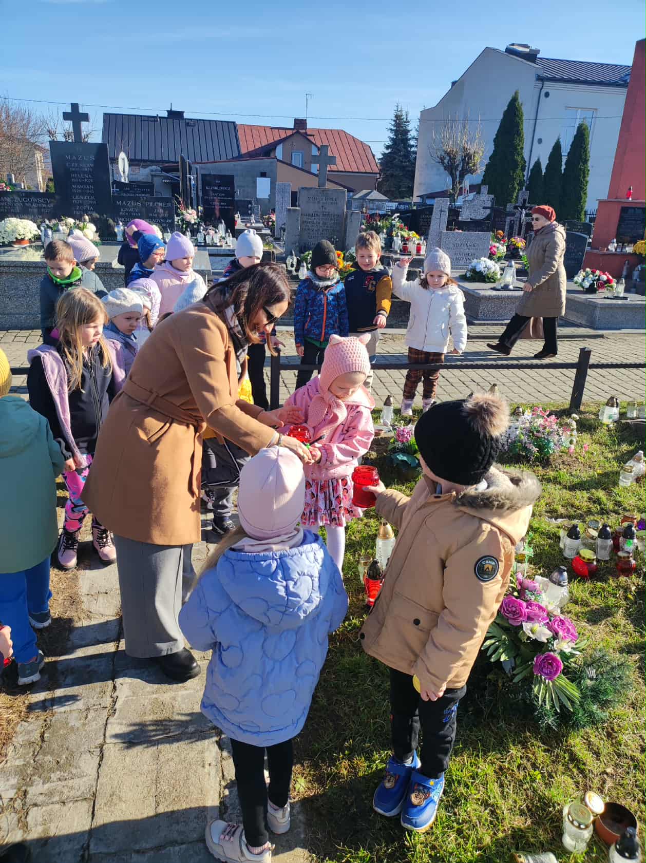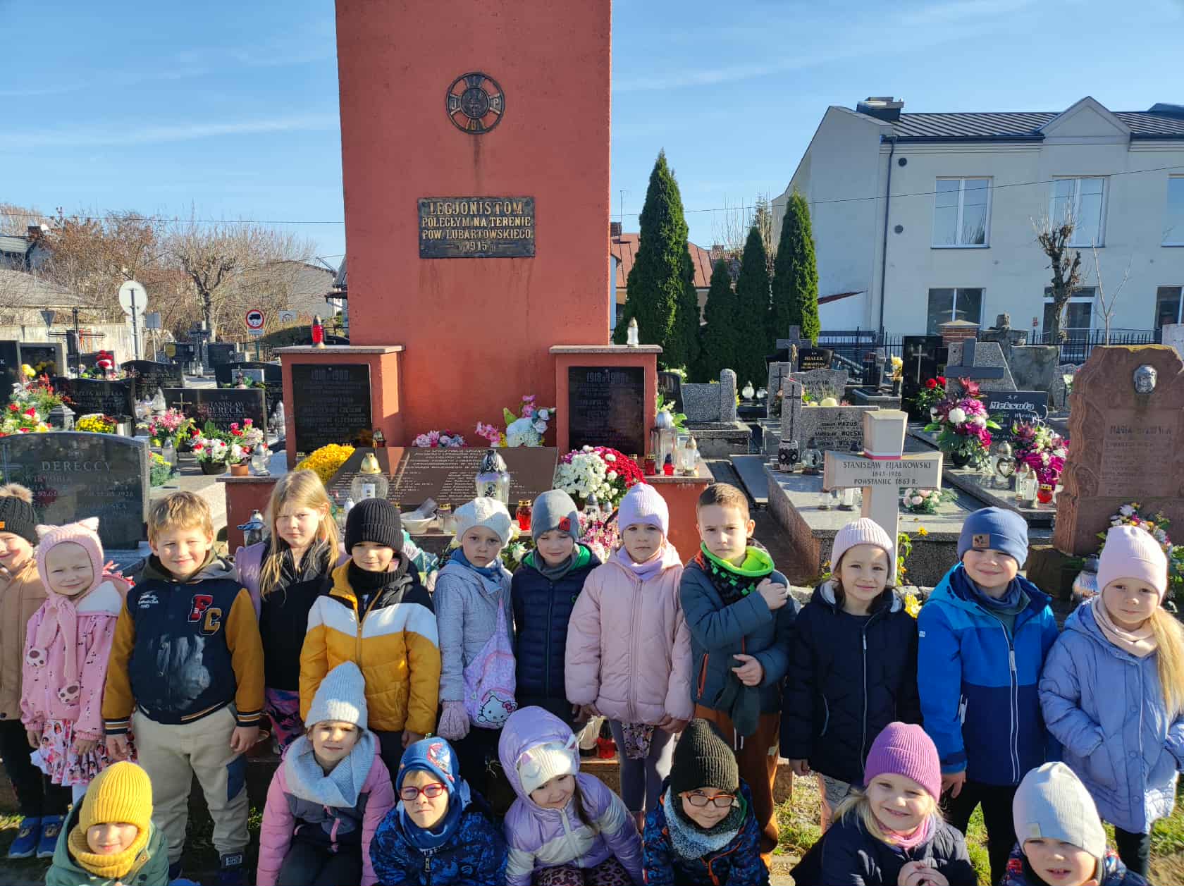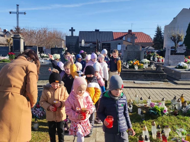 W dniu 05.11. przedszkolaki z grupy Wiewiórki wybrały się na pobliski Cmentarz, po to, aby zapalić znicze na grobie nieznanego żołnierza. Dzieci w zadumie wraz ze swoimi paniami uczciły minutą ciszy pamięć Żołnierzy poległych za naszą Ojczyznę. Wszyscy spędzili spacer po cmentarzu w atmosferze ciszy i skupienia. Dzieci zadawały szeptem pytanie dobrze wiedziały, jak należy się zachować w tym miejscu. Była to ważna lekcja wychowania patriotycznego, obywatelskiego oraz rodzinnego, która pozostanie dzieciom na długo w pamięci.
