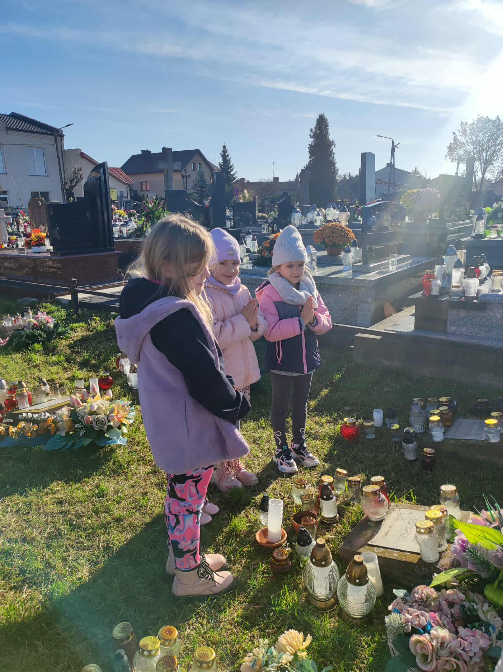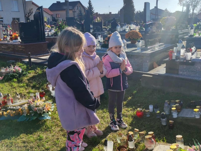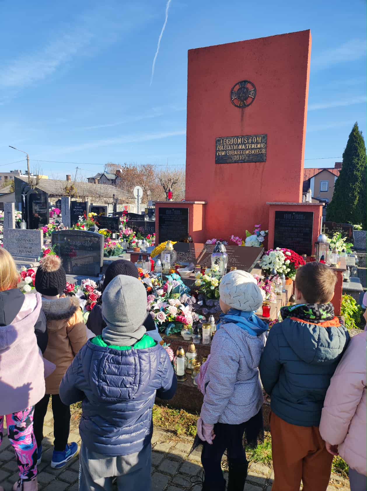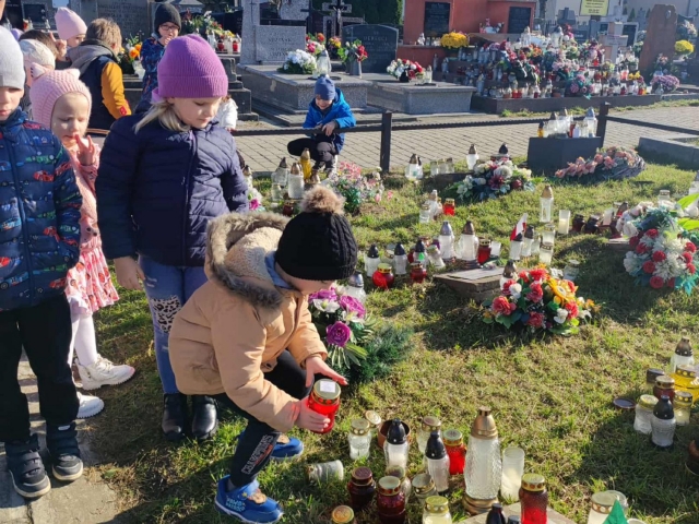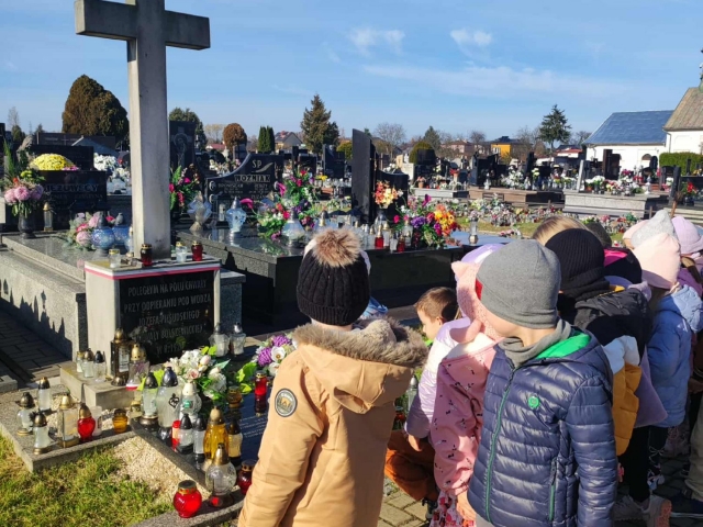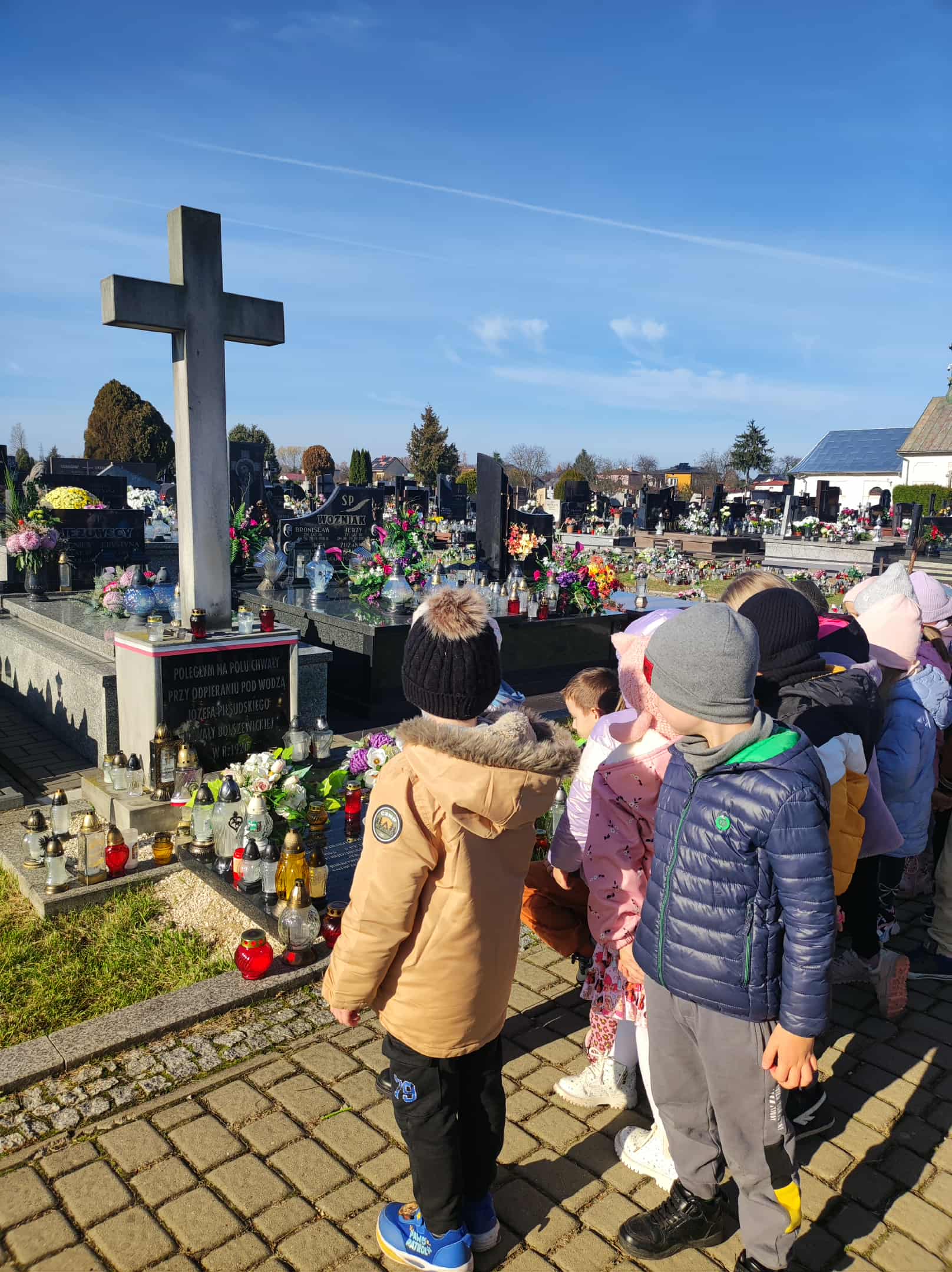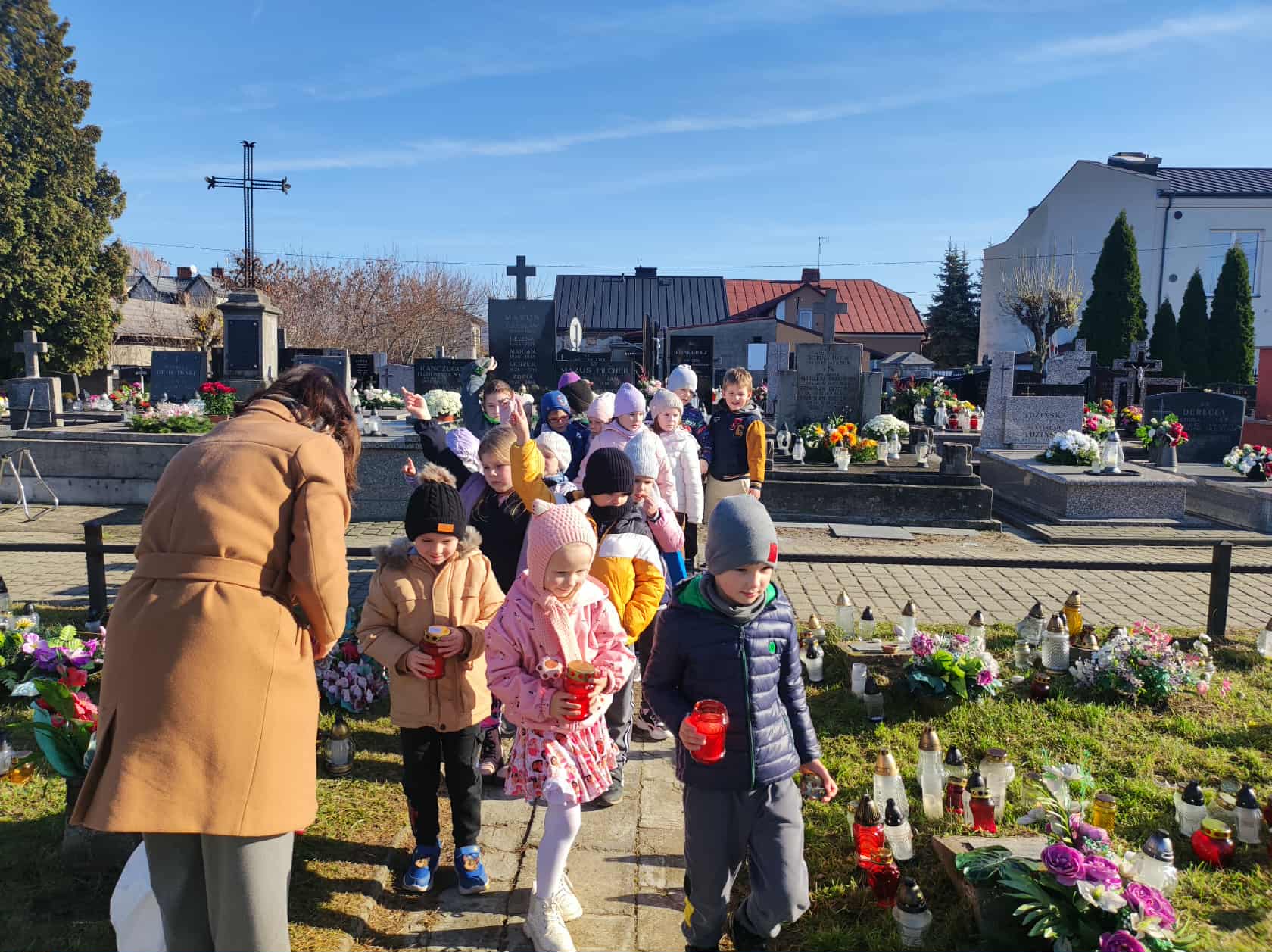 W dniu 05.11. przedszkolaki z grupy Wiewiórki wybrały się na pobliski Cmentarz, po to, aby zapalić znicze na grobie nieznanego żołnierza. Dzieci w zadumie wraz ze swoimi paniami uczciły minutą ciszy pamięć Żołnierzy poległych za naszą Ojczyznę. Wszyscy spędzili spacer po cmentarzu w atmosferze ciszy i skupienia. Dzieci zadawały szeptem pytanie dobrze wiedziały, jak należy się zachować w tym miejscu. Była to ważna lekcja wychowania patriotycznego, obywatelskiego oraz rodzinnego, która pozostanie dzieciom na długo w pamięci.