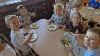 16 października dzieci z grupy Wiewiórki uczestniczyły w zajęciach kulinarnych, podczas których samodzielnie przygotowywały sałatkę owocową. Przedszkolaki z dużym zaangażowaniem obierały, kroiły i mieszały przygotowane wcześniej owoce. Zajęcia te stanowiły doskonałą okazję do kształtowania samodzielności, koordynacji ruchowej, a także do nauki współpracy w grupie. Dzieci miały możliwość przekonania się, że wspólne przygotowywanie posiłków może być nie tylko smaczne, ale również stanowić doskonałą formę spędzania czasu z rówieśnikami oraz z rodzicami. Po zakończonej pracy nadszedł moment degustacji. Wszystkie dzieci z apetytem kosztowały przygotowaną przez siebie sałatkę, która okazała się prawdziwym sukcesem kulinarnym. Zajęcia dostarczyły wszystkim uczestnikom wielu pozytywnych emocji i radości, a zdobyte doświadczenie z pewnością zachęci przedszkolaków do dalszych kulinarnych eksperymentów.