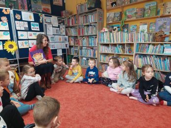 2 października Elfy wraz ze swoimi paniami uczestniczyły w zajęciach bibliotecznych, podczas których utrwaliły wiadomości dotyczące nowej pory roku, jaką jest „Jesień”.  Dzieci  obejrzały prezentację edukacyjną w czasie której dowiedziały się jakie zmiany zachodzą w przyrodzie i dlaczego liście zmieniają kolor. Przedszkolaki poznały także „dary jesieni” – m.in. owoce, warzywa, szyszki i orzechy, kasztany, żołędzie, które o tej porze roku są szczególnie cenne. Wszyscy  z zainteresowaniem słuchali, jak w czasie nowej pory roku ptaki i zwierzęta przygotowują się do zimy. Nie zabrakło zagadek dźwiękowych i ciekawostek przyrodniczych. Na zakończenie Elfy miały możliwość pokolorowania obrazka o tematyce jesiennej. Serdecznie dziękujemy pracownikom Miejskiej Biblioteki  Publicznej im. A. Mickiewicza za ciepłe przyjęcie i ciekawe zajęcia! To była wspaniała, edukacyjna przygoda!