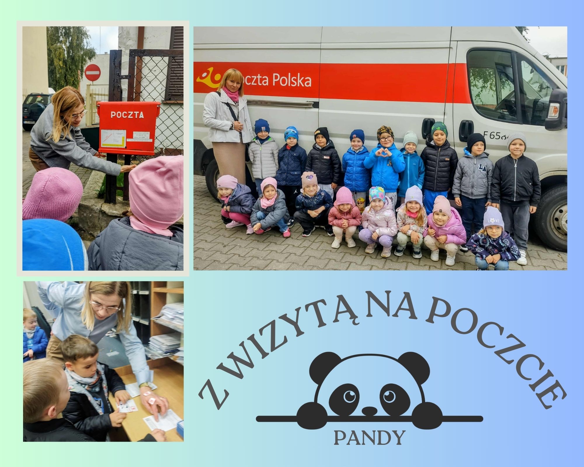W ramach obchodów „Dnia Poczty Polskiej”  6 października grupa Pand wybrała się z wizytą do Urzędu Pocztowego. Przedszkolaki mogły z bliska przyjrzeć się pracy urzędników oraz utrwalić wiadomości na temat tej instytucji użyteczności publicznej. Dzieci poznały wyposażenie urzędu od zaplecza, drogę listu od nadawcy do adresata, zwróciły uwagę na skrzynki pocztowe, logo poczty. Dowiedziały się również na czym polega praca listonosza. Każda Panda miała też okazję przybić pieczątki pocztowe. Na zakończenie wizyty przedszkolaki otrzymały kolorowanki, pocztówki oraz słodki upominek. Wycieczka była dla Pand dużym przeżyciem.
