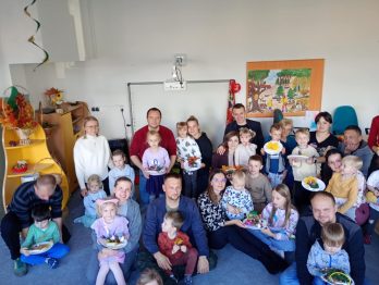 Jesień to kolorowa pora roku, która ,,przynosi” ze sobą bogactwo darów przyrody. Przedszkolne kąciki przyrody zapełniły się kasztanami, szyszkami, kolorowymi liśćmi, żołędziami.Dnia 15.10.2025r. do wspólnej pracy i zabawy z darami jesieni- dzieci z grupy Misie zaprosiły swoich rodziców. Spotkanie składało się z dwóch części. Pierwsza – to zajęcia otwarte, w czasie których rodzice mieli okazję zaobserwowanie swojego dziecka w czasie różnych aktywności, w kontaktach z dziećmi i dorosłymi. Mogli poznać przyjaciół swojego dziecka, ich rodziny. Po krótkim powitaniu, przedszkolaki recytowały wiersz mówiący o charakterystycznych cechach jesieni. Odczytywały emocje z kolorowych kart. Następnie ćwiczyły spostrzegawczość wzrokową i prawidłowy chwyt – odszukując cień do obrazka i zapinając na nim klamerkę. Było przeliczanie darów przyrody przez chętne dzieci i indywidualnie. W drugiej części zajęć zaprosiliśmy do wspólnej zabawy rodziców. Były zabawy ruchowe przy muzyce. Układaliśmy rytmy, a rodzic z dzieckiem w parze interpretowali ruchem zapis graficzny. Najwięcej radości sprawiło wszystkim tworzenie jesiennych kompozycji ze skarbów jesieni. Widać było zaangażowanie, ciche rozmowy, śmiech na twarzach uczestników. Powstały wspaniałe, kolorowe kompozycje tworzone przez dzieci, rodziców oraz rodzeństwo. Zajęcia zakończyła wystawa prac oraz pamiątkowe zdjęcie. Mamy nadzieję, że czas spędzony przez rodziców z dziećmi był dla wszystkich miłym wytchnieniem po dniu pracy i wspaniałą zabawą.